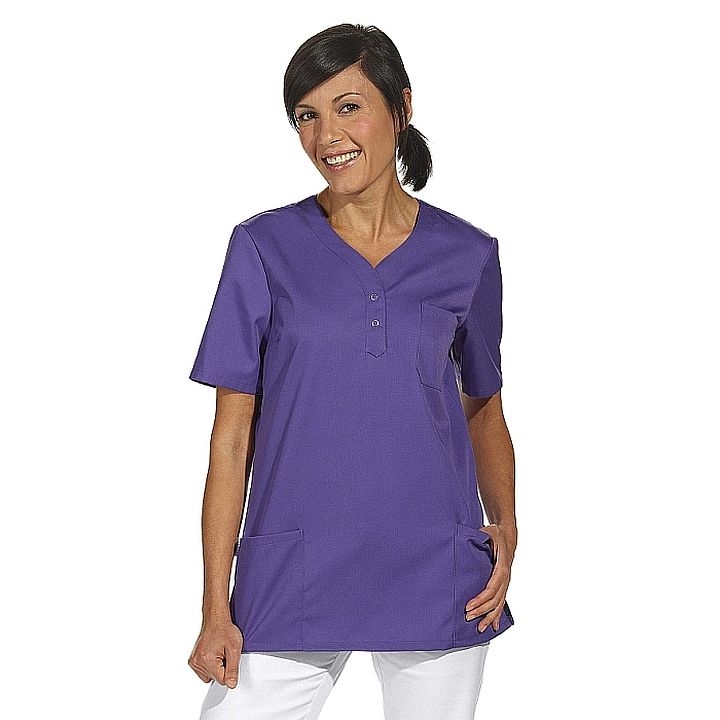 Farbenfroher Leiber Schlupfkasack 08/1254 für Damen mit geschwungenem V-Ausschnitt und dezenten Ringdruckknöpfen.  Dieser Damenkasack ist aus einem klassischen Mischgewebe gefertigt und ist somit robust und langlebig.