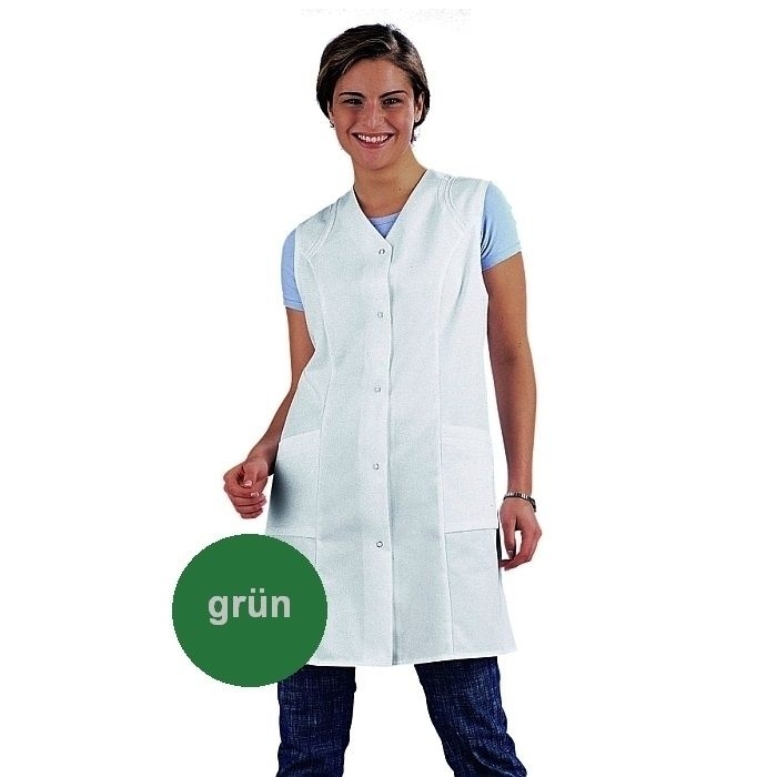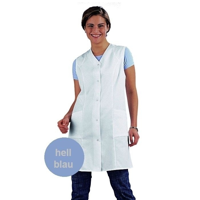 Ärmelloser Leiber 7/8 Damenkasack 09/390 mit leicht geschwungenem V-Ausschnitt und dezenten Designdruckknöpfen. Dieser Damenkasack ist aus einem klassischen Mischgewebe gefertigt und ist somit robust, langlebig und für industrielle Waschverfahren geeignet.