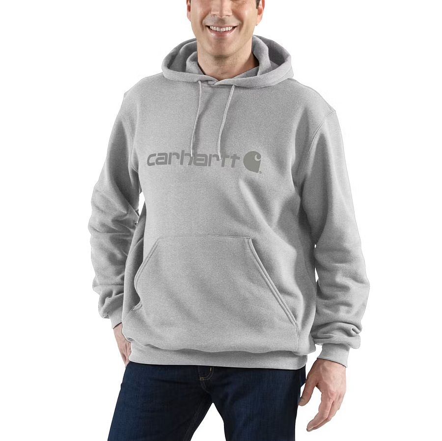 Das Design besticht durch eine dreiteilige Kapuze mit verstellbarem Kordelzug und eine praktische Kängurutasche vorne, in der sich Hände wärmen oder Kleinigkeiten verstauen lassen. Die elastanverstärkten Rippstrickbündchen an Ärmeln und Saum sorgen für Langlebigkeit und einen guten Sitz. Das markante Carhartt „Signature Logo“ auf der Vorderseite verleiht dem Hoodie einen authentischen Look.