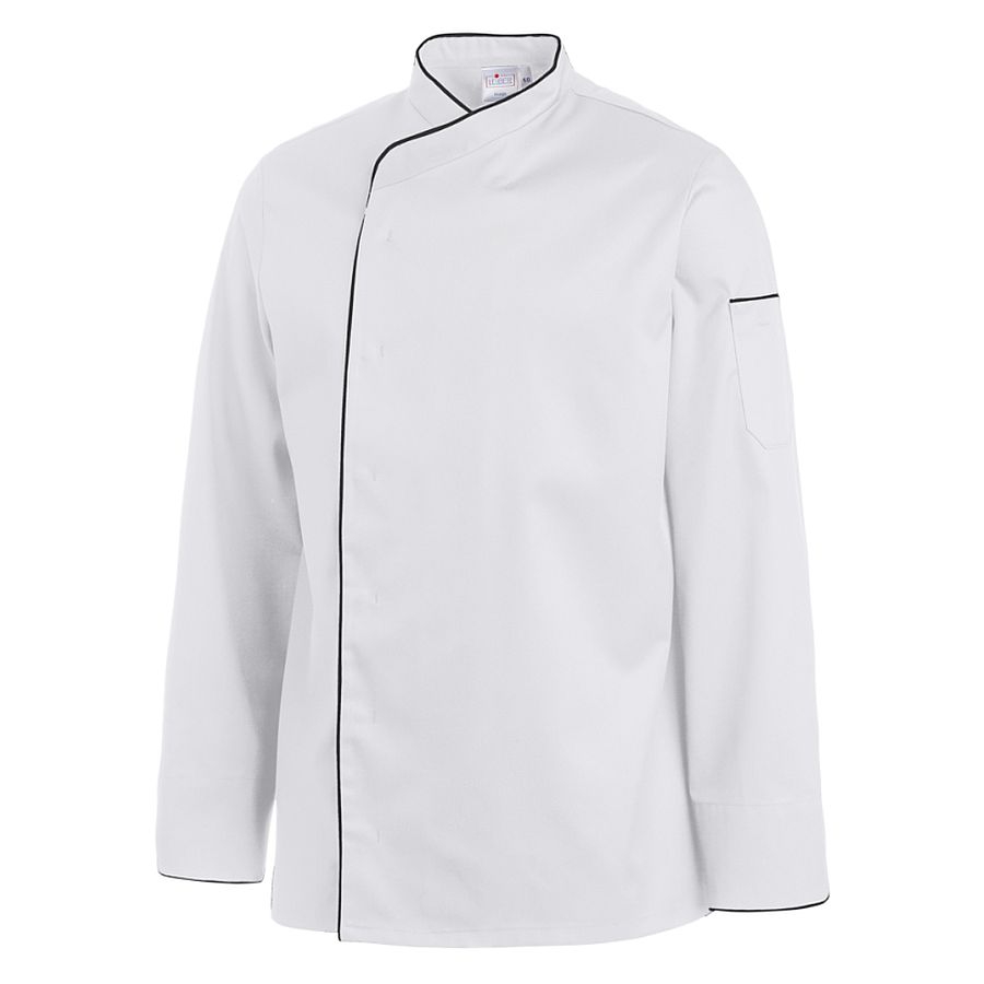 Elegante Leiber Herren Kochjacke 12/2598 aus robustem und pflegeleichten Mischgewebe, die Paspeln am Kragen, Übertritt, Manschetten und der Ärmeltasche sind in Kontrastfarbe. Die Kochjacke hat am Rückenbereich eine Golffalte für mehr Bewegungsfreiheit. So bequem kann es heutzutage in der Küche zugehen.