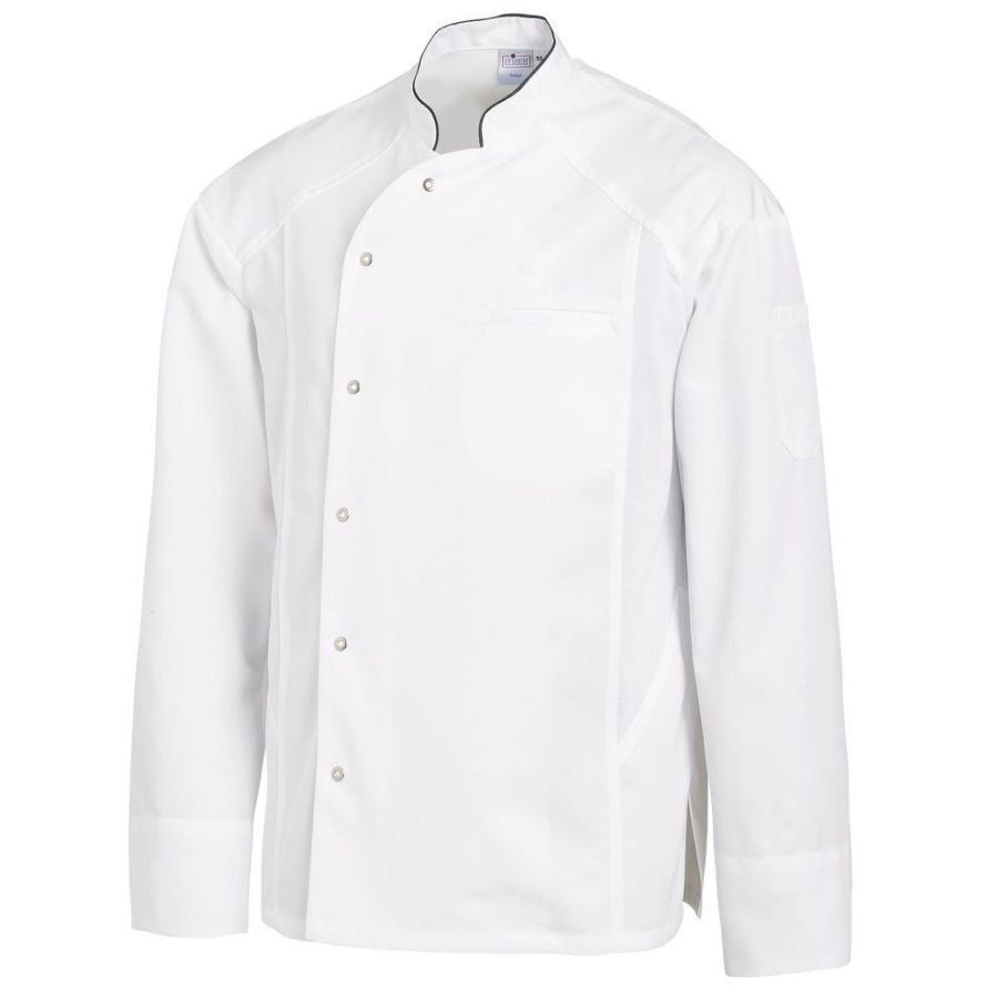 Leichte Leiber Kochjacke 12/2753 aus Web- und Piqué-Ware aus TENCEL, mit Druckknopfleiste und Lüftungslöchter. Zudem verfügt die Kochjacke über eine eingelassene, zugenähte Brusttasche, die bei Bedarf einfach aufgetrennt werden kann.