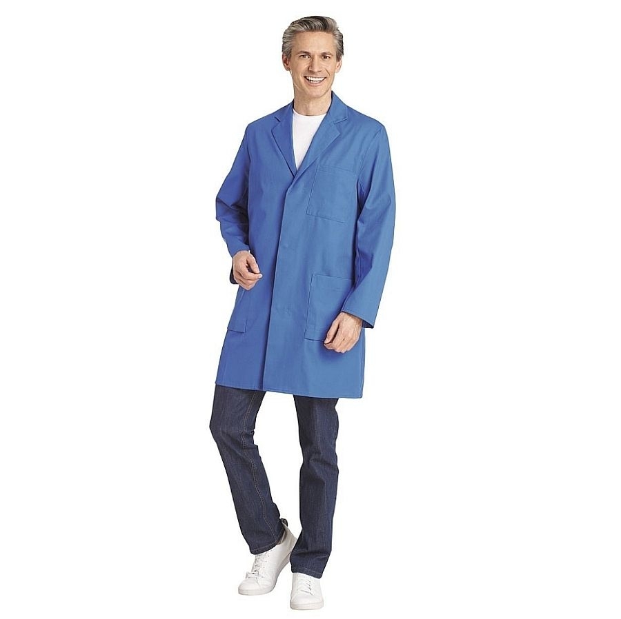 Leiber Herrenmantel 12/492 mit Reverskragen und verstärkten Sicherheitstaschen. Das verarbeitete Mischgewebe überzeugt durch einen angenehmen Tragekomfort und eignet sich darüber hinaus für industrielle Waschverfahren.