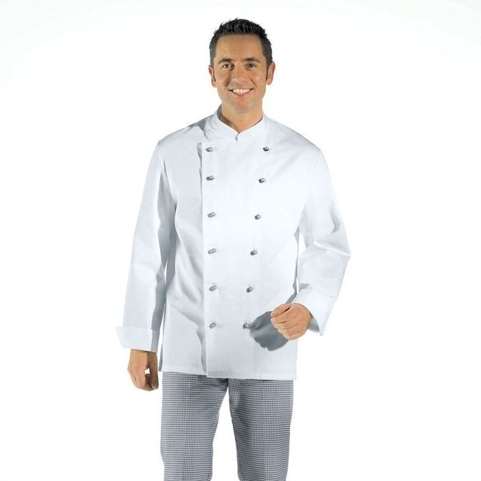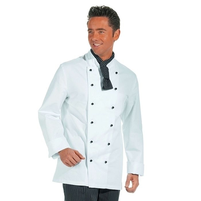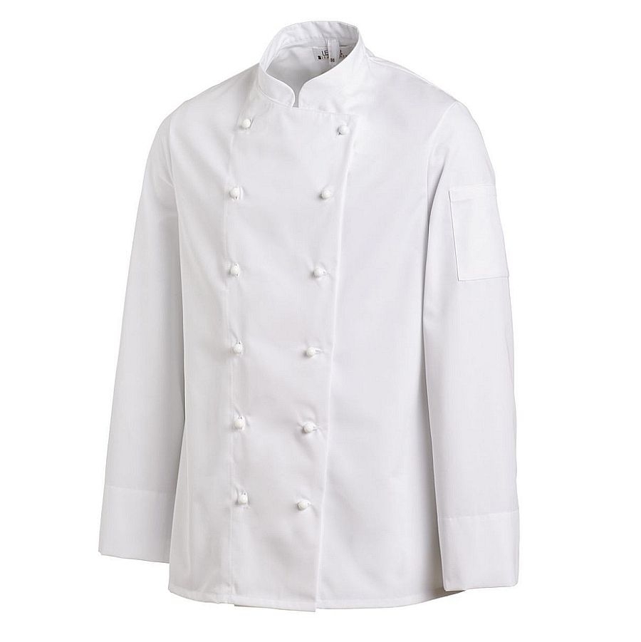 Klassische Leiber Kochjacke aus extrem robusten und industriewäsche-geeignetem Mischgewebe. Die Kochjacke 12/8790 ist für die Verwendung von Kugelknöpfen mit 6-Loch-Knopfreihen vorbereitet und besitzt eine praktische Stifttasche auf dem linken Oberarm.