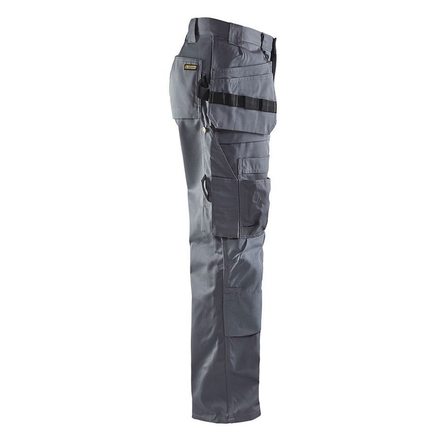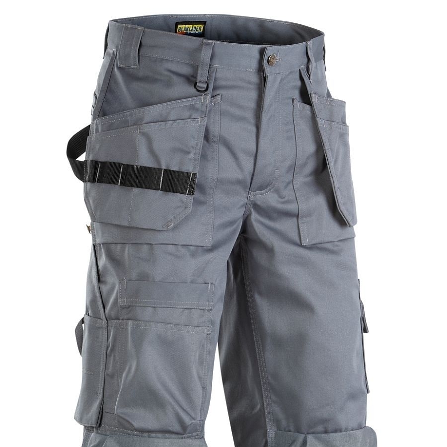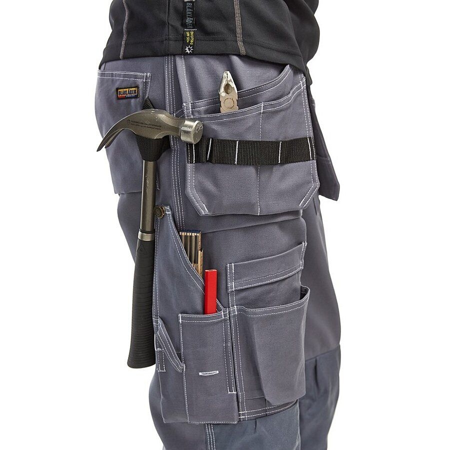 Die 1532 Arbeitshose für Bodenleger von Blakläder Workwear bietet jede Menge Funktionalität und Arbeitskomfort im harten Arbeitsalltag. Ausgestattet mit CORDURA® verstärkten Holstertaschen und nach EN14404 zertifizierten Kniepolstertaschen schützt und unterstützt die 1532 Blakläder Bodenlegerhose. Die zusätzliche Tasche auf dem Oberschenkel garantiert schnellen Zugriff auf Material und Werkzeug auch bei kniender Arbeitsposition. Das verschleißfeste Mischgewebe ist sehr scheuer- und abriebbeständig und darüber hinaus pflegeleicht und farbbeständig. Der Baumwollanteil im Gewebe garantiert ein angenehmes Trage- und Hautgefühl.