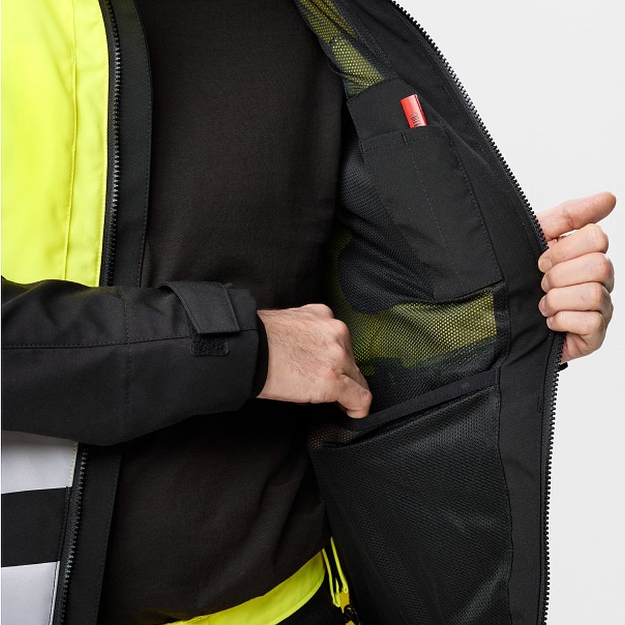 Zahlreiche durchdachte Taschenlösungen sorgen für hohe Funktionalität: Zwei Brusttaschen mit Reißverschluss (eine mit praktischem Ausweishalter), zwei gefütterte Vordertaschen mit Reißverschluss sowie mehrere Innentaschen (inkl. Brusttasche mit Reißverschluss und Stiftfächern) bieten viel Stauraum. Ein verstellbarer Kordelzug am Saum, formgeschnittene Ärmel sowie Klettverschlüsse an den Ärmelabschlüssen ermöglichen eine individuelle Passform. Der verlängerte Rücken schützt zusätzlich vor Wind und Kälte – ideal für wechselhafte Wetterbedingungen auf der Baustelle oder unterwegs.