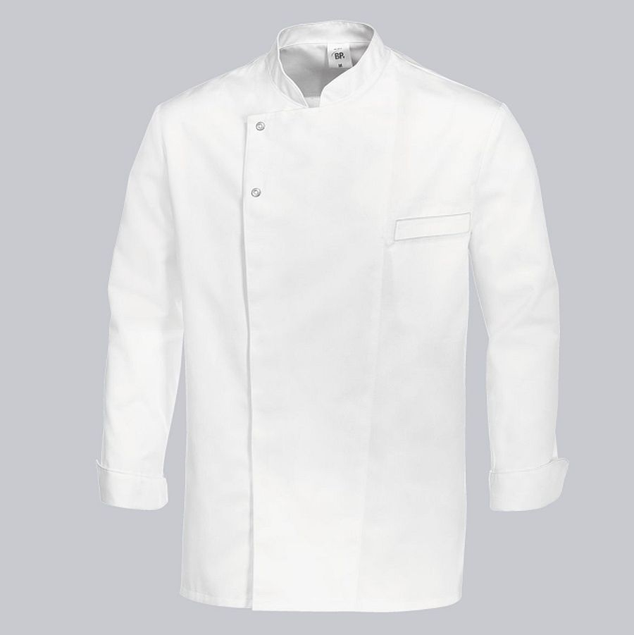 BP Kochjacke aus robustem Mischgewebe. Ausgestattet mit Stehkragen, Edelstahl-Druckknöpfen und Brusttasche. Die zwei sichtbaren Edelstahl-Druckknöpfe sorgen für einen individuellen und legeren Style.