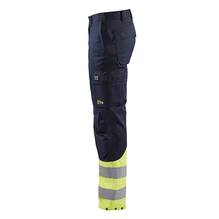 Die flammhemmende Arbeitshose 1705 in der Qualität 1519 mit einem inhärenten Stoff der Klasse E3, der speziell für Arbeiten in der Metallindustrie entwickelt wurde bei denen mit geschmolzenem Eisen gearbeitet wird. Die Klasse 1 highvis-zertifizierte Arbeitshose schützt vor Spritzern von geschmolzenem Metall und vor Strahlungshitze. Die Hose hat eine verstellbare Beinweite durch einen Druckknopf am Knöchel, eine Beintasche mit Patte auf der linken Seite und Ausweishalter. Sie besitzt außerdem einen Messerhalter, eine Handytasche, Zollstocktasche und Gesäßtaschen mit Patten. Getestet für Industriewäsche. Zertifiziert nach EN ISO 20471, EN 1149-5, EN13034, EN ISO 11612, EN ISO 11611, IEC 61482-2, EN 14404, ATPV: 14 cal/cm², ELIM: 12 cal/cm².