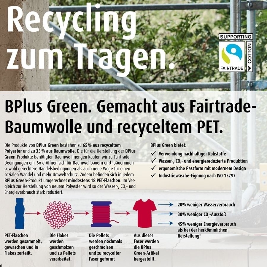 Die Kollektion BPlus Green aus dem Hause BP besteht aus recyceltem Polyester und Fairtrade-Baumwolle. Durch den Einsatz dieser nachhaltigen Produkte wird der Verbrauch an Wasser, CO² und Energie nachhaltig reduziert. Darüber hinaus garantiert die BPlus Green Kollektion ein sportives Design, überragende Bewegungsfreiheit und jede Menge innovativer Detaillösungen. Die körpernahe Passform sorgt für ein modernes Design und garantiert in Kombination mit dem innovativen Mischgewebe maximale Bewegungsfreiheit. Innovative Taschenlösungen sorgen für effizientes Arbeiten und optimale Bewegungsabläufe.