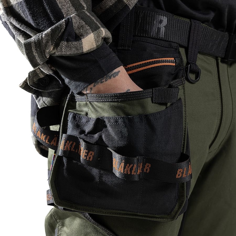 - Verstärkte Zollstocktasche mit Messerhalter und Stifttasche.
