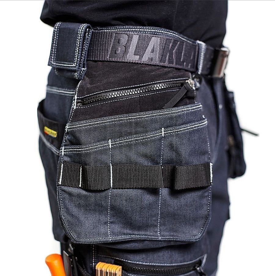 - Breite Gürtelschlaufen, hinten und an den Seiten, Zwei Schlaufen mit Klettverschluss an den Seiten zur Befestigung des Hammerhalters.