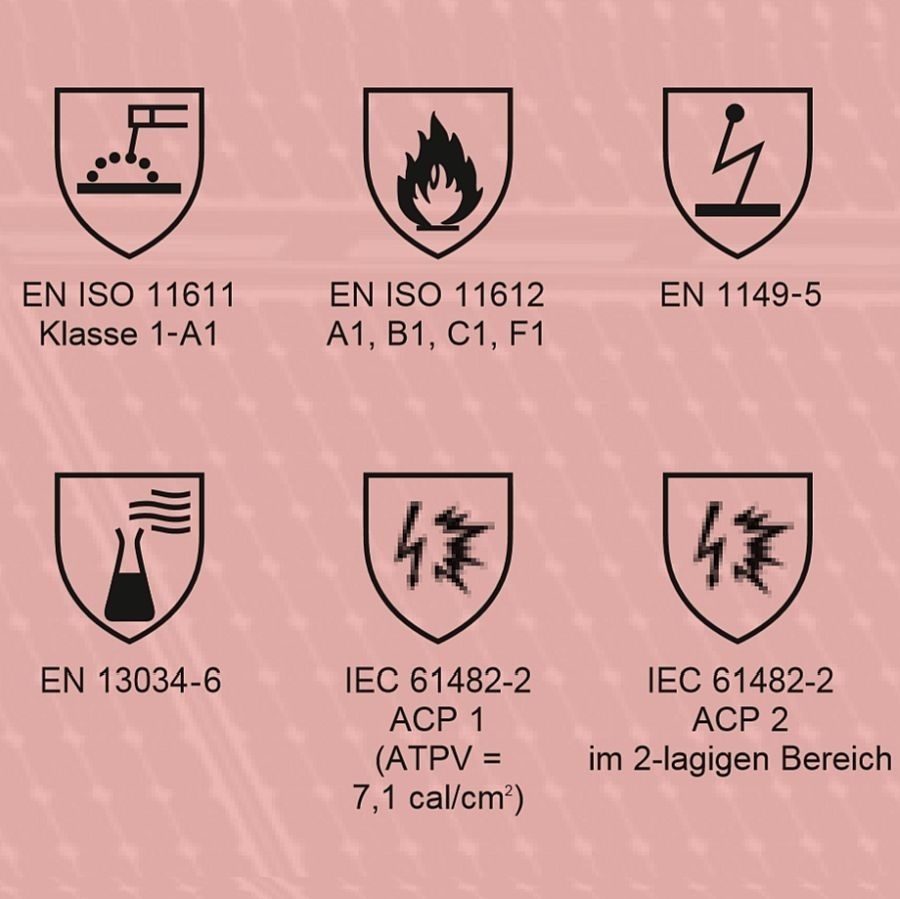 - EN ISO 11612 Hitze- und Flammschutz A1 B1 C1 F1