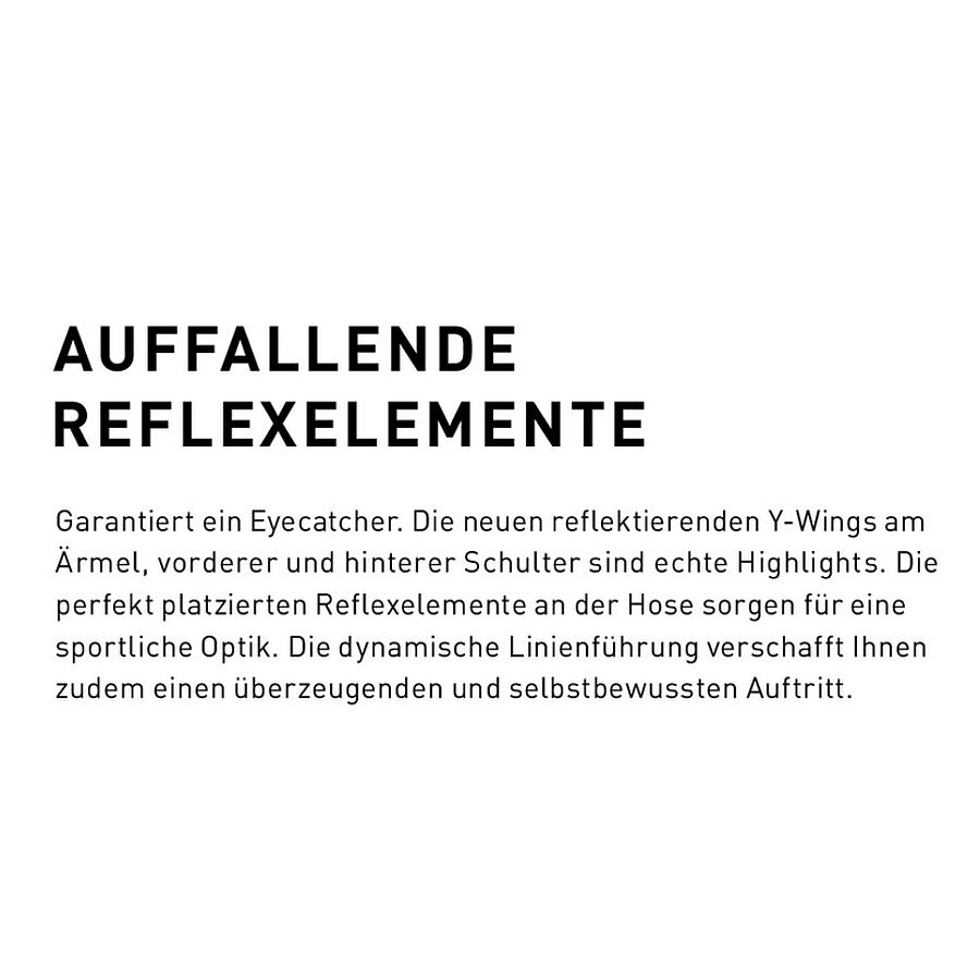- Reflex-Elemente: ober- und unterhalb Knie (Y-Wings), Biese in Kniekehlennaht.