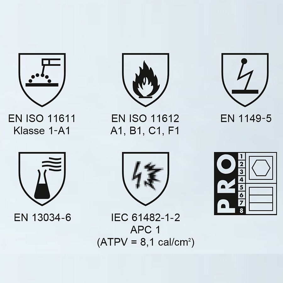 - EN ISO 11612 Hitze- und Flammschutz A1 B1 C1 F1