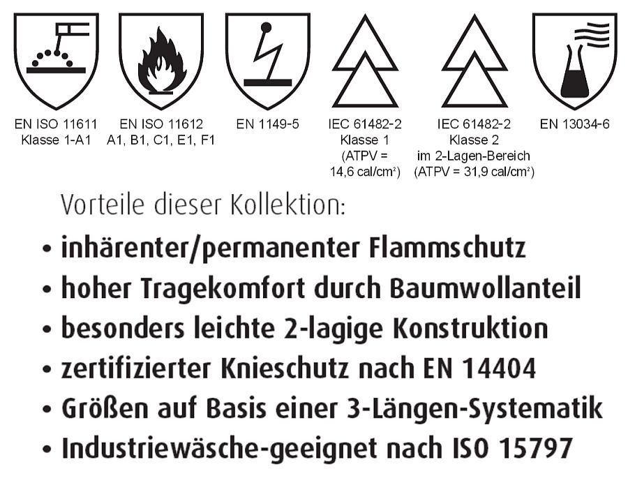 | Zertifizierung: | Chemikalienschutz EN 13034, Elektrostatischer Aufladung EN1149, Fair Wear zertifiziert, Hitze/Flammschutz EN11612, Industriewäsche ISO 15797, Knieschutz EN14404, Lichtbogen EN 61482, Schweisserschutz EN ISO 11611, Öko-Tex Standard 100 |
