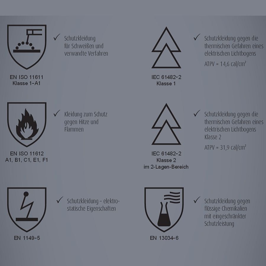 - EN ISO 11611 cl.1-A1; EN ISO 11612 A1, B1, C1, E1, F1; EN 1149-5; EN 61482-1-2 cl.1; EN 61482-1-2 cl.2 im zweilagigen Bereich; EN 13034-6