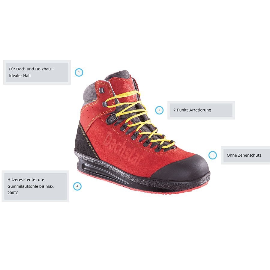 Hohe Flexibilität und Bewegungsfreiheit: Dachdecker und Zimmerer benötigen Beweglichkeit bei Arbeiten in gebückter oder kniender Position. Die Dachstar-Sicherheitsschuhe zeichnen sich durch flexible Materialien aus, die eine hohe Bewegungsfreiheit bieten, ohne dabei an Schutz zu verlieren.