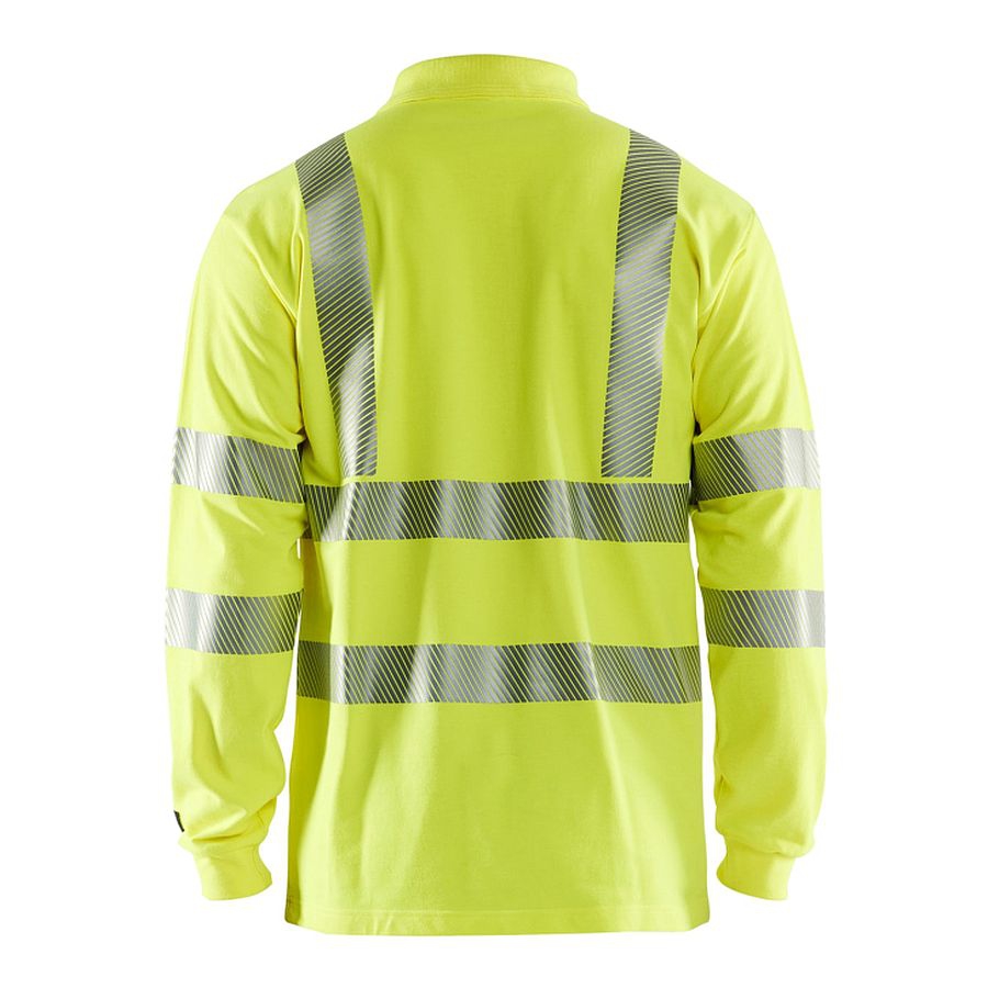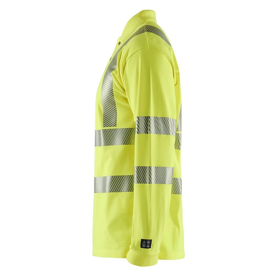 Langarm Warnschutz Polo Shirt mit flammhemmenden, diagonalen Reflexstreifen. Strickkragen und verstärkte Schulter- und Kragennähte. Zertifiziert nach EN ISO 20471 Klasse 3, höhere Sichtbarkeit bei der Arbeit in harter Umgebung. Flammhemmend, Lichtbogen und antistatisch. Zertifiziert nach EN 1149-5, EN ISO 11612 A1, B1, C1, IEC 61482-2 Klasse 1.