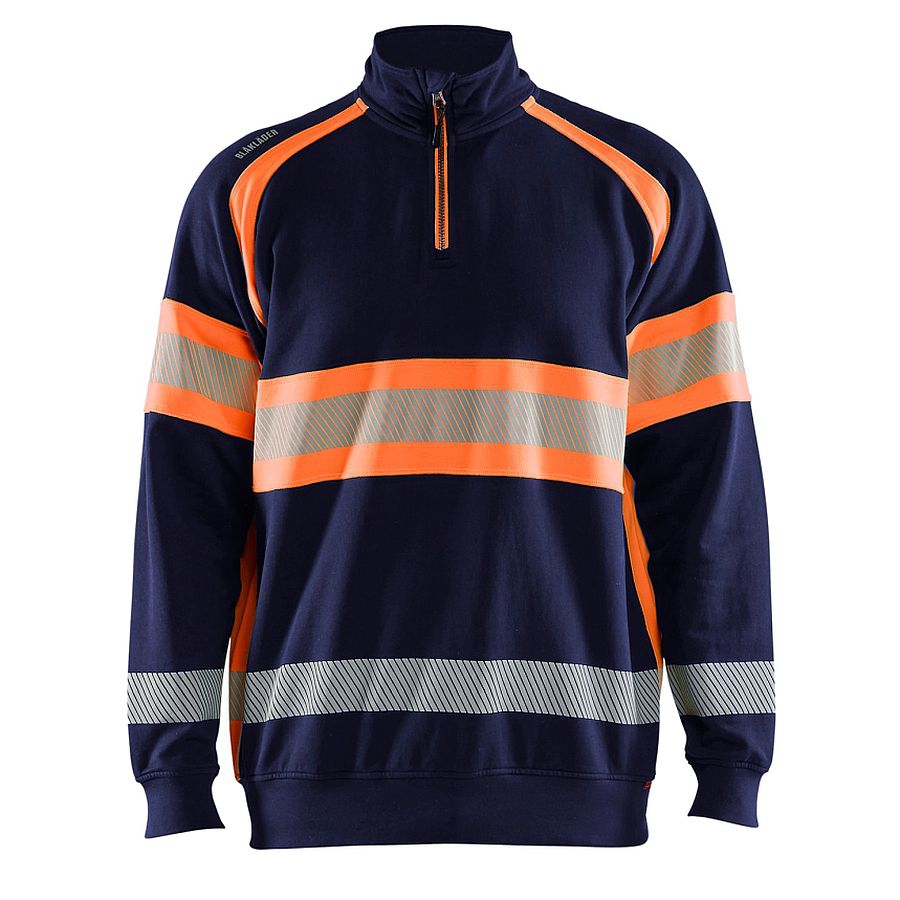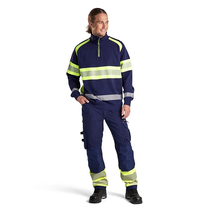 Ein weicher und bequemer High Vis Sweater mit unterbrochenen Reflexstreifen für besonders gute Stretch-Fähigkeit und Atmungsaktivität. Er hat einen hohen Kragen, einen Half Zip-Reißverschluss und Bündchen an der Unterseite und den Ärmelenden für höheren Komfort. Der dunkle Teil des Sweaters besteht aus 100 Prozent Baumwolle und der High Vis-Teil ist aus 100 Prozent Polyester gefertigt. Zertifiziert nach EN ISO 20471, Klasse 1.