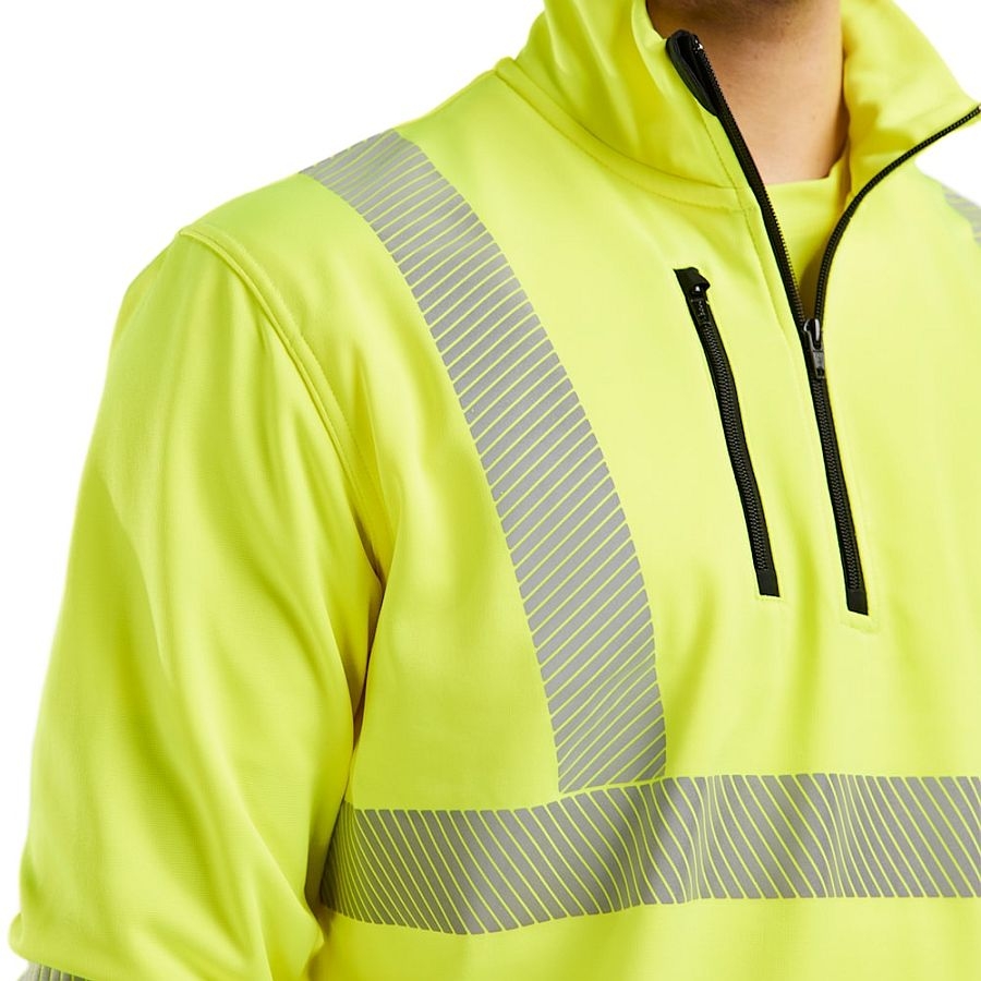 Ein Sweatshirt in High Vis Klasse 3 mit unterbrochenen Reflexstreifen für zusätzliche Sichtbarkeit. Das Material des High Vis Sweatshirts ist ein weiches und angenehmes Fleece, das eine unschlagbare Kombination aus Sicherheit und Komfort bietet. Es hat einen Kragen, einen Half-Zip Reißverschluss, eine Brusttasche und Rippstrickbündchen. Es kann industriell gewaschen werden. Zertifiziert nach EN ISO 20471 Klasse 3. Industriewäsche EN ISO 15797.