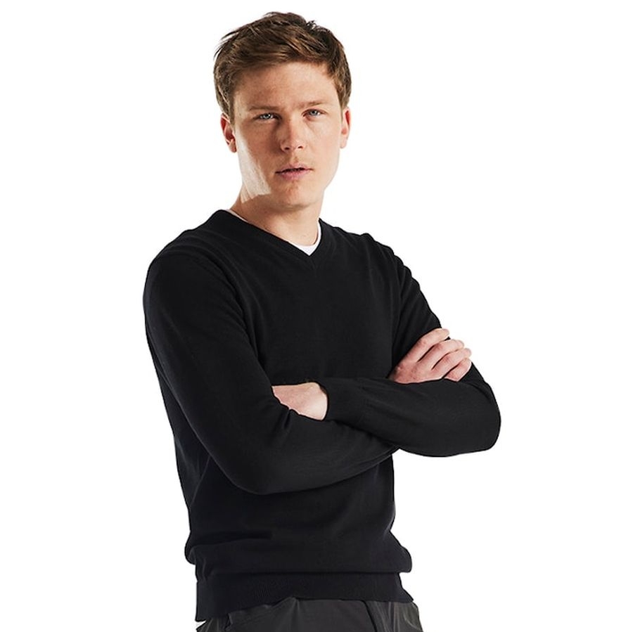 Gestrickter V-Ausschnitt Pullover, der perfekt zu den Blåkläder Chinos 1465 passt, für einen stilvollen Business-Look bei der Arbeit.