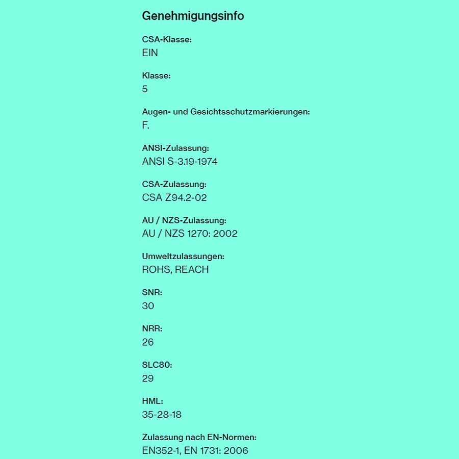 - Zulassung nach EN-Normen: EN352-1, EN 1731: 2006