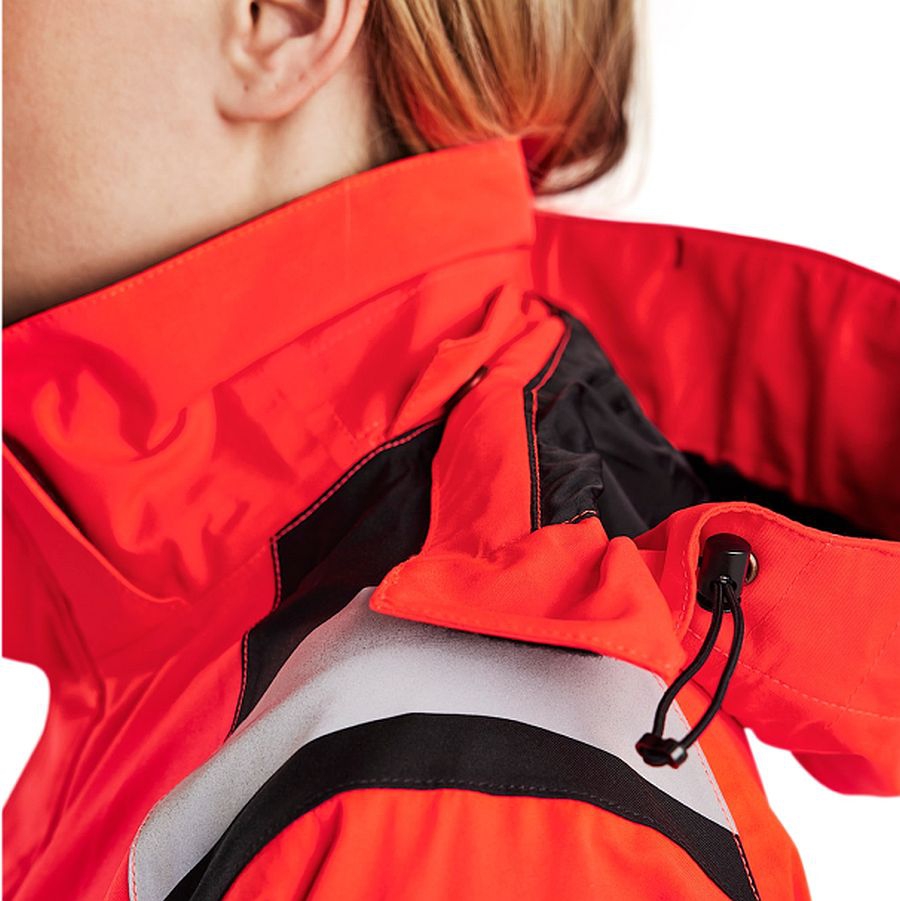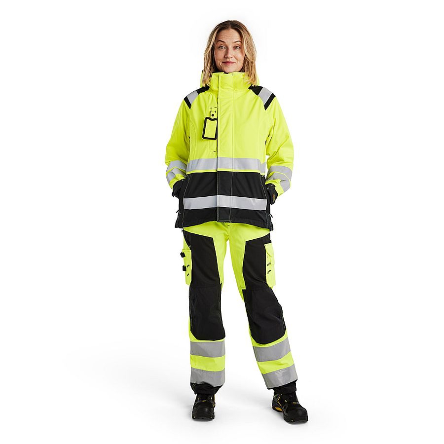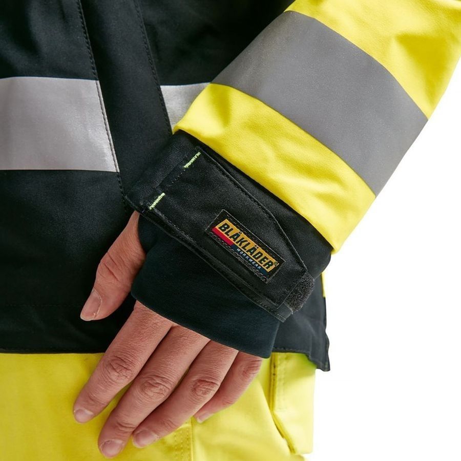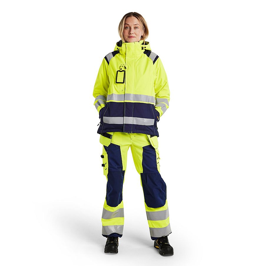 Die Wind- und wasserdichte Außenjacke 4904 für Damen von Blakläder Workwear. Die Jacke besitzt ein aufgerautes Mesh Futter und alle Nähte sind verschweißt. An den beanspruchtesten Stellen wurden dunkle Kontrastfarben eingesetzt, um vor Verschmutzung zu schützen. Für einen erhöhten Tragekomfort sorgen eine abnehmbare Kapuze und ein hoher, mit Fleece gefütterter, Kragen. Die Bewegungsfreiheit wird durch einen Zwei-Wege-Reißverschluss, vorgeformte Arme und einen verlängerten Rücken erhöht. 50 mm breite Reflexstreifen sorgen für Sichtbarkeit. Intelligente Taschenlösungen bieten enorm viele Verstaumöglichkeiten.