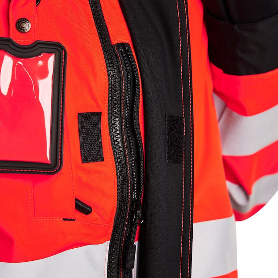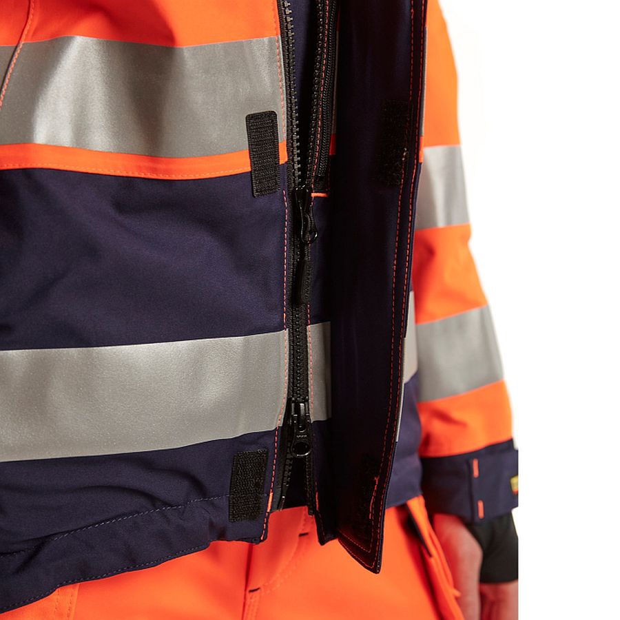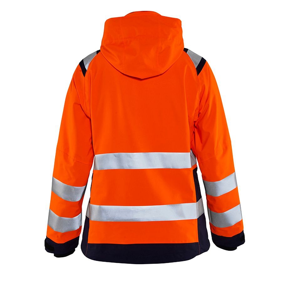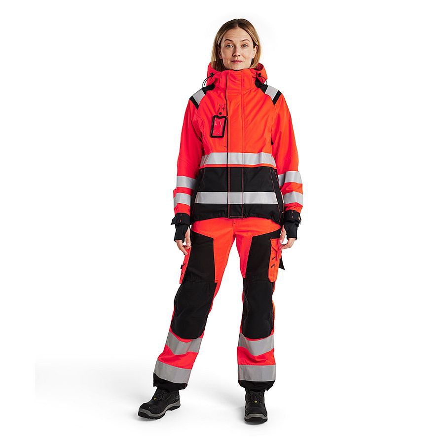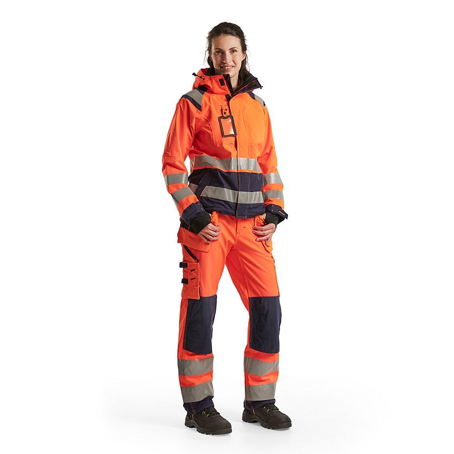 Die Wind- und wasserdichte Außenjacke 4904 für Damen von Blakläder Workwear. Die Jacke besitzt ein aufgerautes Mesh Futter und alle Nähte sind verschweißt. An den beanspruchtesten Stellen wurden dunkle Kontrastfarben eingesetzt, um vor Verschmutzung zu schützen. Für einen erhöhten Tragekomfort sorgen eine abnehmbare Kapuze und ein hoher, mit Fleece gefütterter, Kragen. Die Bewegungsfreiheit wird durch einen Zwei-Wege-Reißverschluss, vorgeformte Arme und einen verlängerten Rücken erhöht. 50 mm breite Reflexstreifen sorgen für Sichtbarkeit. Intelligente Taschenlösungen bieten enorm viele Verstaumöglichkeiten.