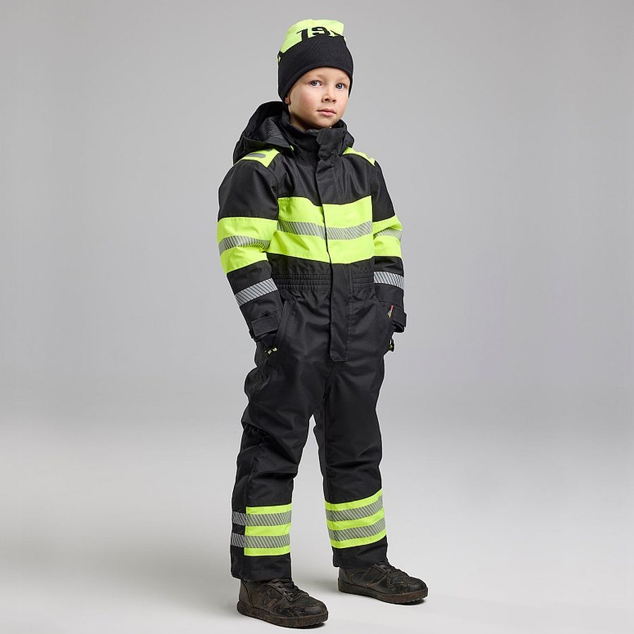 Besonders hervorzuheben ist die Zertifizierung nach EN 17353 Typ AB3, die für hohe Sichtbarkeit in dunklen und gefährlichen Umgebungen steht. Zusätzlich erhöhen Reflexdetails, u. a. am Rücken der Kapuze, die Sichtbarkeit im Straßenverkehr. Die abnehmbare, verstellbare Kapuze mit Meshfutter, der fleecegefütterte Kragen sowie elastische Fußschlaufen und verstellbare Ärmelbündchen garantieren einen festen Sitz und hohen Komfort. Dank durchdachter Funktionen wie dem verdeckten Reißverschluss mit Windleiste, Schneefang mit Klett und Knopf sowie den praktischen Seitentaschen mit Reißverschluss ist dieser Kinder-Winteroverall ein absolut verlässlicher Begleiter in der kalten Jahreszeit – langlebig, sicher und kindgerecht.