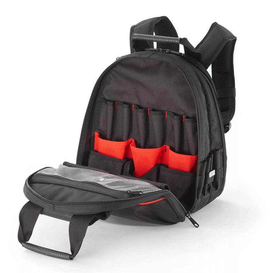Der Werkzeugrucksack ist ein ergonomischer, universell einsetzbarer Begleiter für Handwerker und Techniker. Ausgestattet mit zwei großen Reißverschlussfächern, die sich vollständig öffnen lassen, bietet er maximale Übersicht und einfachen Zugriff auf das gesamte Werkzeug. Ein zusätzliches, gepolstertes Fach an der Seite bietet sicheren Platz für Laptops, Tablets und Dokumente bis zu einer Größe von 15 Zoll. Hergestellt aus extrem strapazierfähigem, ballistischem Polyester mit einer Gewebedichte von 1680 Denier, garantiert der Rucksack hohe Verschleißfestigkeit und Langlebigkeit. Auf der Vorderseite befindet sich eine große Tasche mit Schnallenriemen, ideal zur Befestigung von sperrigen Geräten, Materialien, Kabeln und Zubehör. Der Rucksack verfügt über 48 Taschen und Werkzeughalterungen, darunter ein Metallclip für Maßbänder und mittelgroße Fächer mit Deckeln und Reißverschlüssen für die sichere Aufbewahrung empfindlicher Geräte. Die ergonomisch geformten, gepolsterten Schultergurte sorgen für hohen Tragekomfort, auch bei längeren Einsätzen. Der Rucksack wurde mit einer statischen Beladung von 60 kg getestet und bietet somit eine hohe Belastbarkeit.