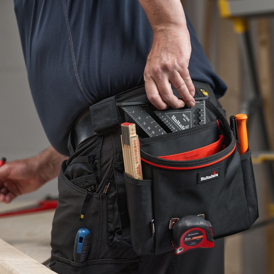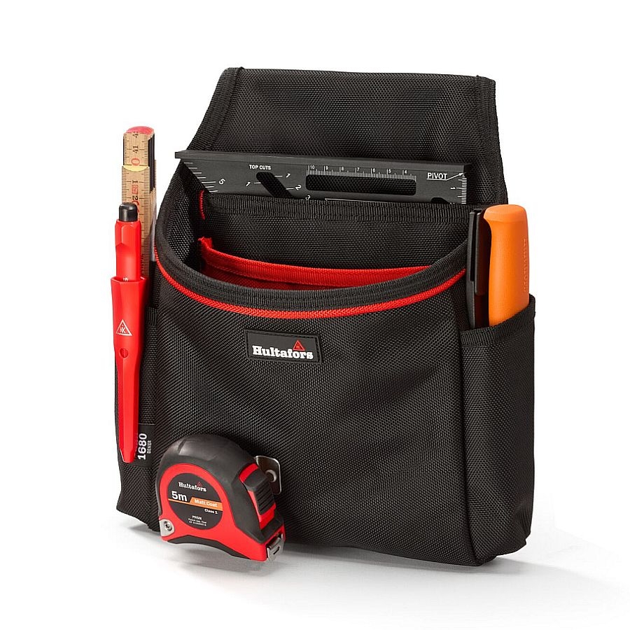 Die Tasche verfügt über drei geräumige Innenfächer, darunter ein speziell entwickeltes Fach für das Hultafors MRS Anschlagwinkeldreieck (mittlere Größe) – perfekt geschützt und jederzeit zugänglich. Zwei praktische Seitentaschen ermöglichen den schnellen Zugriff auf häufig verwendete Werkzeuge wie Schraubendreher oder Zimmermannsbleistifte. Besonders clever: Ein integrierter, stabiler Maßbandhalter, der leicht zugänglich an der Vorderseite angebracht ist.