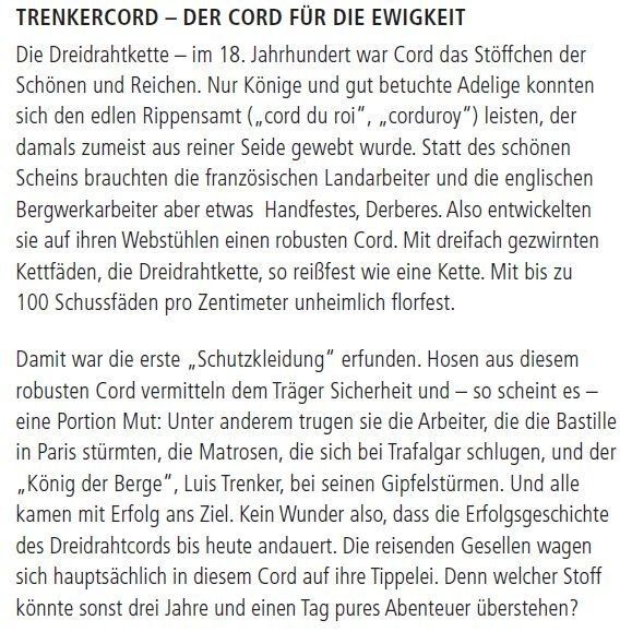 - Trenkercord Dreidraht ist die schwerste und robusteste Cordqualität im FHB Sortiment mit einem dreifach gezwirnten Kettfaden.