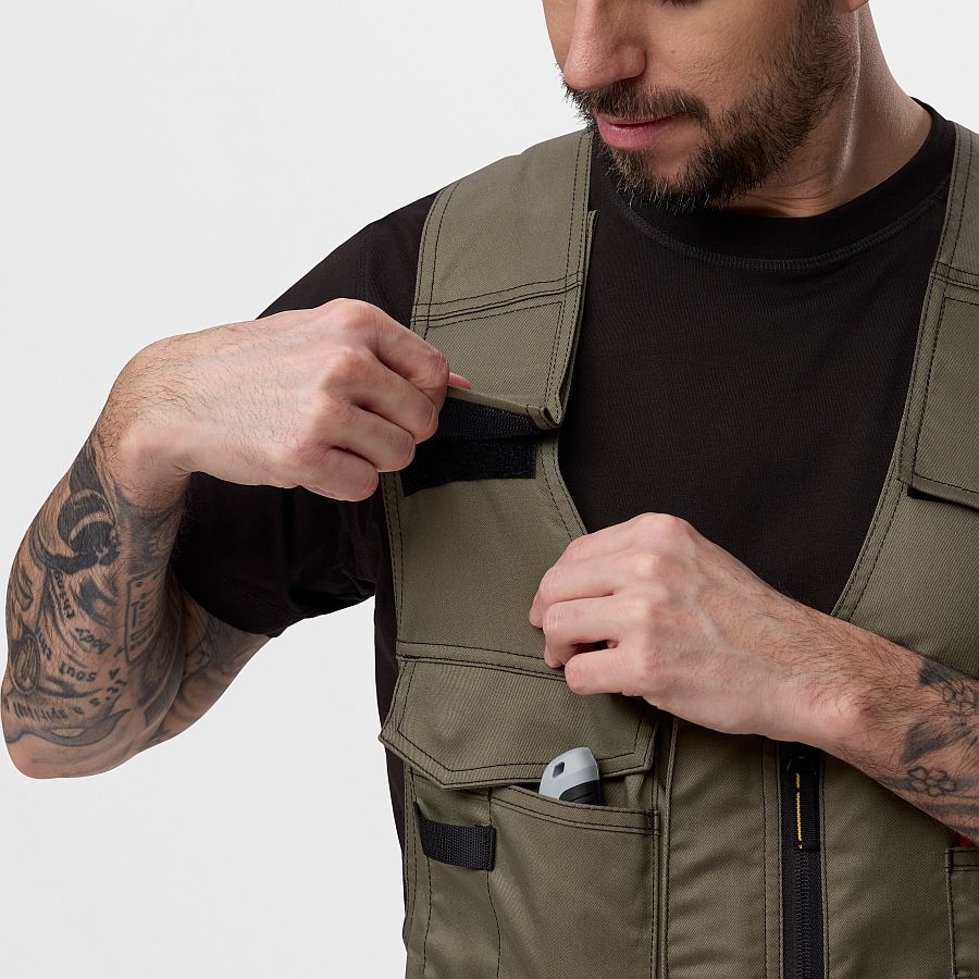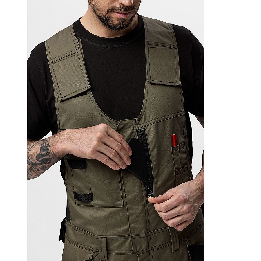 Die Arbeitshose verfügt über praktische Holstertaschen, Brusttaschen mit Stiftfächern, Cargo- und Werkzeugtaschen, die viel Stauraum und perfekte Organisation ermöglichen. Die verstellbaren Träger sorgen für einen optimalen Sitz und hohen Tragekomfort – selbst bei langen Arbeitstagen.