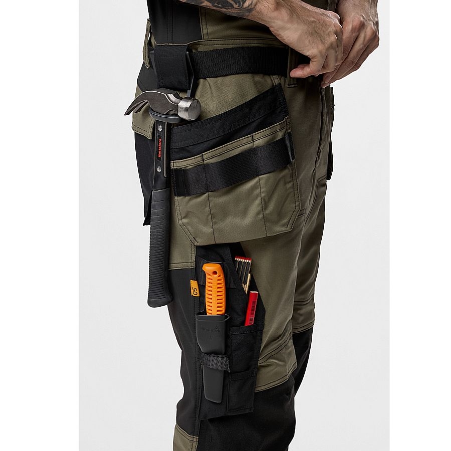Das Herzstück dieser Kombi-Arbeitshose ist das robuste Gewebe mit mechanischer Stretchfunktion, das nicht nur Bewegungsfreiheit garantiert, sondern auch besonders langlebig ist. Ergänzt wird dieses durch strategisch platzierte CORDURA®-Verstärkungen an den Knien, Holstertaschen und der Zollstocktasche – für eine noch höhere Widerstandsfähigkeit in stark beanspruchten Bereichen.