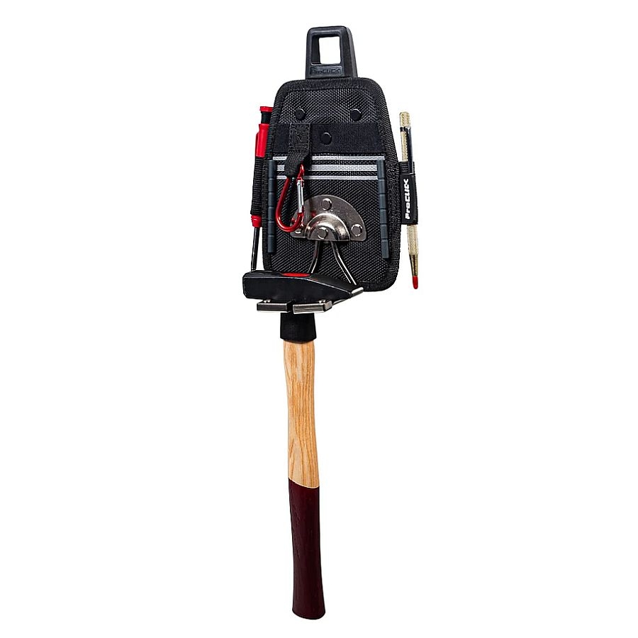 Gefertigt aus langlebigem 1000D Polyester, ist der ProClick Hammerhalter wie gemacht für den harten Baustellenalltag. Zwei Stiftschlaufen bieten Platz für Zimmermannsbleistifte oder Marker. Eine seitliche Bandschlaufe erlaubt die Anbringung eines Karabiners, z. B. für Handschuhe oder weiteres Zubehör. Reflektierende Sicherheitsstreifen erhöhen zusätzlich die Sichtbarkeit bei schlechten Lichtverhältnissen.