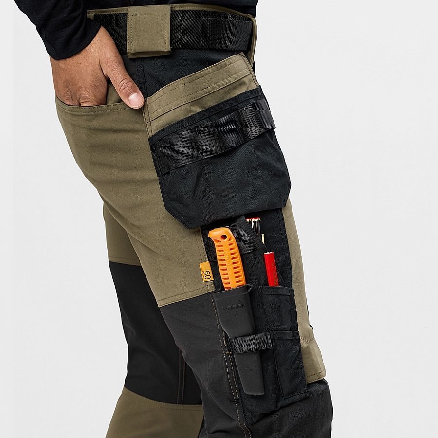 Mit CORDURA®-Verstärkungen an beanspruchten Stellen ist die Hose besonders langlebig und abriebfest. Die integrierten Holster- und Cargotaschen, darunter eine mit innenliegendem Handytaschenfach, bieten viel Platz für Werkzeug und persönliche Gegenstände. Für zusätzlichen Schutz sorgen Knietaschen, die ebenfalls mit CORDURA® ausgestattet sind und mit dem DIN EN 14404 zertifizierten Knieschutz kompatibel sind.