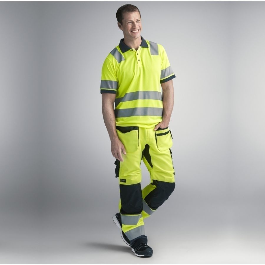 Diese moderne, gut sichtbare Arbeitshose kombiniert erstaunliche Passform und strapazierfähigen Komfort mit fortschrittlicher Funktionalität. Mit professionellem Knieschutz, eingebauter Belüftung und Stretchmaterial im Schritt bist du perfekt und komfortabel ausgestattet. EN 20471, Klasse 2. EN 14404