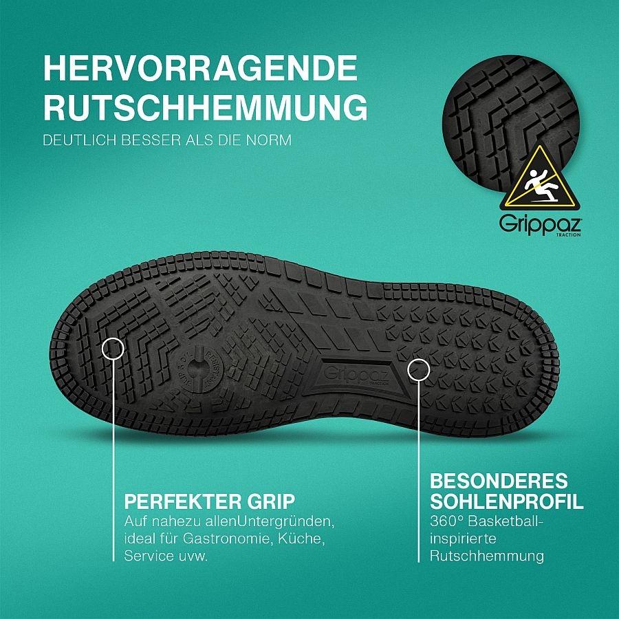 - GRIPPAZ® Traction‑Laufsohle – hervorragender Grip, auch auf nassen Oberflächen.