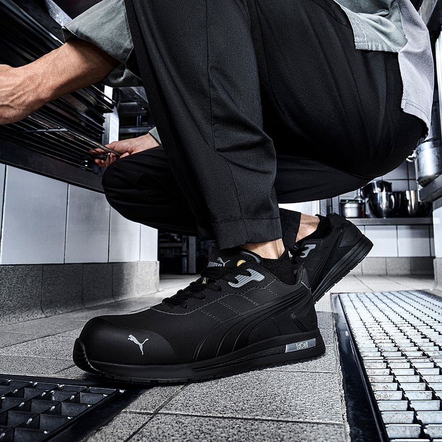 Der PUMA SAFETY BOUNCE BLK LOW Sicherheitsschuh S3S 647050 vereint sportliches Design mit modernster Sicherheitstechnologie – ideal für Industrie, Handwerk oder Gastronomie. Der wasserabweisende Mikrofaser-Schaft ist nicht nur strapazierfähig, sondern auch beständig gegen Reinigungsmittel, tierische Fette und Säuren. Die metallfreie Konstruktion sorgt für ein leichtes Tragegefühl und erhöht die Flexibilität. Die Fiberglaskappe und der flexible FAP®-Durchtrittschutz bieten zuverlässigen Schutz bei jeder Bewegung. Das atmungsaktive BreathActive Funktionsfutter hält die Füße angenehm trocken, während das evercushion® MAX Fußbett für langanhaltenden Komfort sorgt. Die GRIPPAZ® Traction-Laufsohle gewährleistet eine starke Rutschhemmung und optimalen Halt auf anspruchsvollen Untergründen.