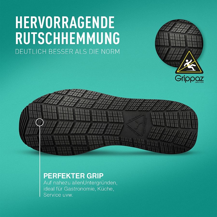 - Laufsohle: GRIPPAZ® Traction mit spezieller Gummimischung für hervorragende Rutschhemmung.