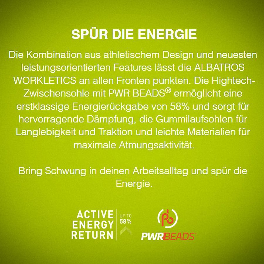Sportliche Sicherheits-Sneaker neu interpretiert. Die Kombination aus athletischem Design und neuestenleistungsorientierten Features lässt die ALBATROS WORKLETICS an allen Fronten punkten. Die Hightech-Zwischensohle mit PWR BEADS® ermöglicht eine erstklassige Energierückgabe von 58%und sorgt für hervorragende Dämpfung, die Gummilaufsohlen für Langlebigkeit und Traktion und leichte Materialien für maximale Atmungsaktivität. Bring Schwung in deinen Arbeitsalltag und spür die Energie.