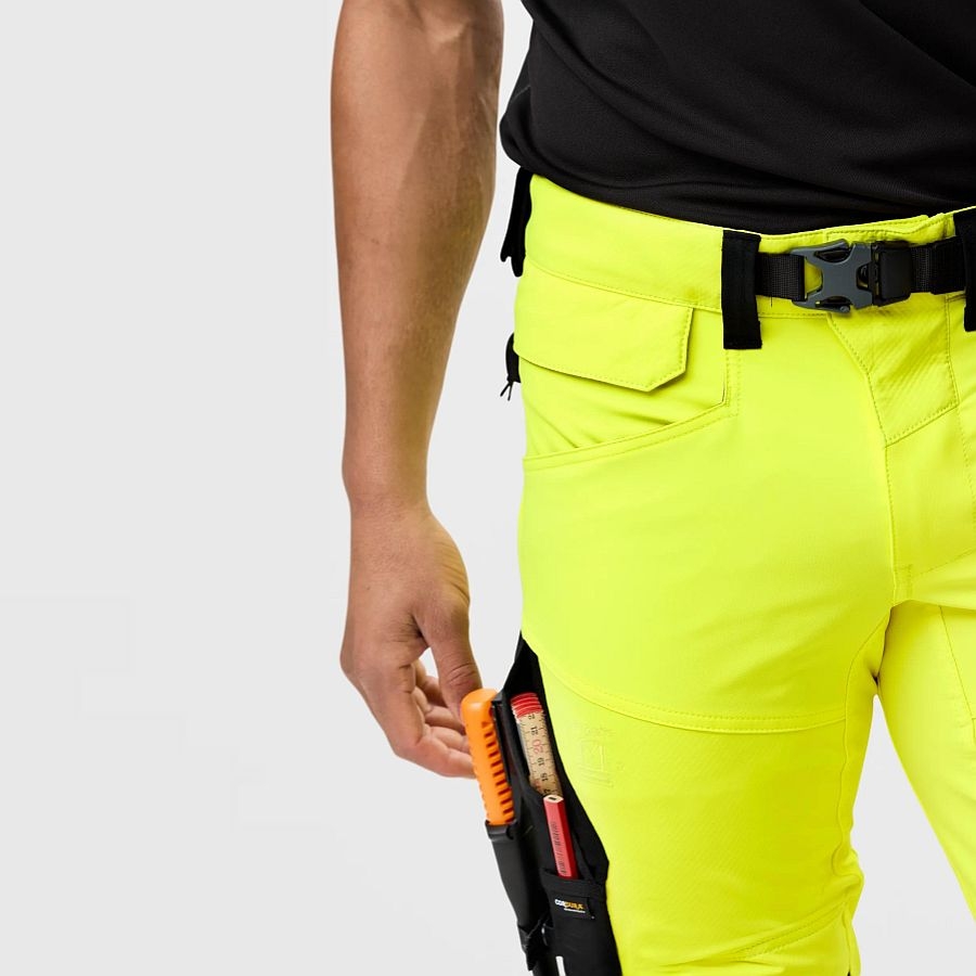 Ein besonderes Highlight der Snickers Workwear 6930 High-Vis-Arbeitshose sind die abnehmbaren Holstertaschen mit CORDURA®-Verstärkungen und Reißverschlussfächern. Ergänzt wird die funktionale Ausstattung durch eine Zollstocktasche, eine geräumige Cargotasche mit Ausweishalter, einen integrierten Gürtel mit robuster Duraflex®-Schnalle sowie einem praktischen Hammerhalter. Für extreme Langlebigkeit sorgt die dreilagige CORDURA®-Verstärkung am Unterschenkel, die nicht nur abriebfest ist, sondern auch vor Nässe schützt.