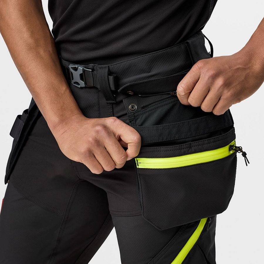 Die segmentierten Heat-Transfer-Reflexstreifen sorgen für eine moderne Optik und erhöhen gleichzeitig die Sichtbarkeit gemäß DIN EN ISO 20471 (Warnschutzklasse 1). Ergänzt wird der Schutz durch das zertifizierte Knieschutzsystem nach DIN EN 14404, bei dem voll dehnbare Armortex® Kevlar®-Fasern von DuPont™ zum Einsatz kommen. Besonders praktisch: Die abnehmbaren Holstertaschen mit CORDURA®-Verstärkungen und Reißverschlussfächern, sowie eine Cargo-Tasche mit Ausweishalter und eine Zollstocktasche – alles durchdacht für den Arbeitsalltag.