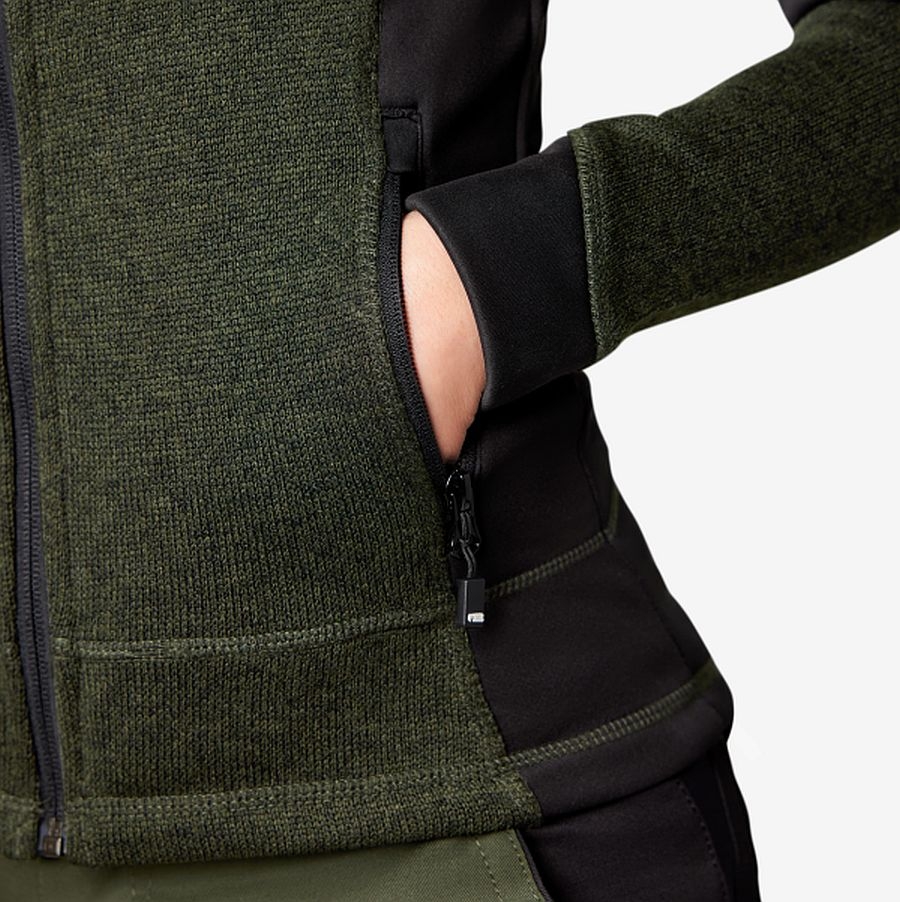Sehr leichte und anschmiegsame Damen Strickfleece Jacke Marieke von FHB. Die schwarzen Seitenbereiche garantieren auf Grund Ihrer Elastizität einen hervorragenden Arbeitskomfort und sorgen für eine perfekte Passform, egal in welcher Haltung Sie arbeiten. Die körpernahe und leicht taillierte Passform läßt Sie nicht nur auf der Baustelle gut aussehen, sondern bietet auch in der Freizeit einen femininen moderen Look.