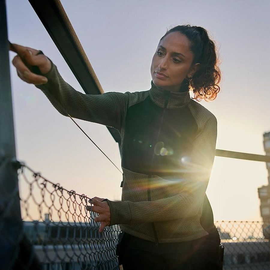 - Windabweisende Softshell-Einsätze im Brustbereich.