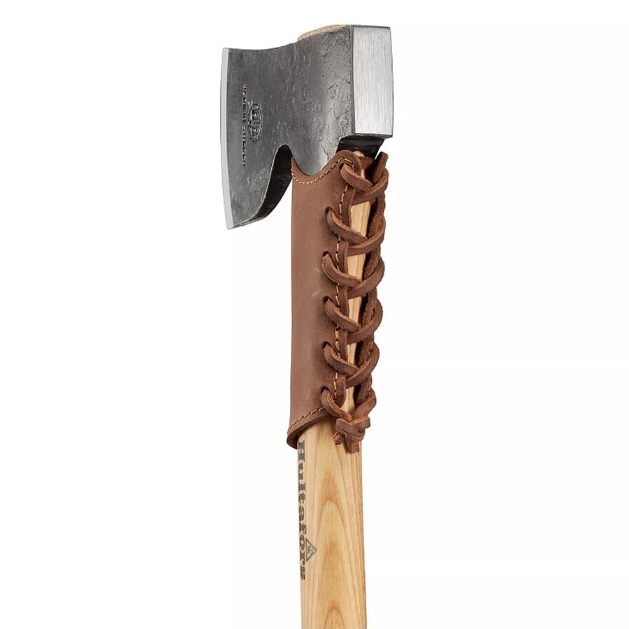 Der Überschlagsschutz OGHB 840793 ist ein hochwertiger Schlagschutz aus Leder, der speziell dafür entwickelt wurde, den Axtstiel direkt unterhalb des Axtkopfes zu schützen. Im Falle eines Überschlags bietet er optimalen Schutz für den Griffbereich, um Beschädigungen zu vermeiden. Dieser Schutz, auch als Stielschutz oder Axthalsband bekannt, wird mit den mitgelieferten Lederschnüren fest um den Griff gebunden und gewährleistet so einen sicheren Halt. Hergestellt wird der Stielschutz in Schweden aus den Häuten schwedischer Kühe. Die Produktion erfolgt mit größter Rücksicht auf die Tiere und die Umwelt. Das verwendete Leder ist pflanzlich gegerbtes Vollnarbenleder, das für seine außerordentliche Haltbarkeit bekannt ist. Durch die natürliche Behandlung altert das Leder im Laufe der Zeit auf besonders ansprechende Weise und entwickelt eine einzigartige Patina.