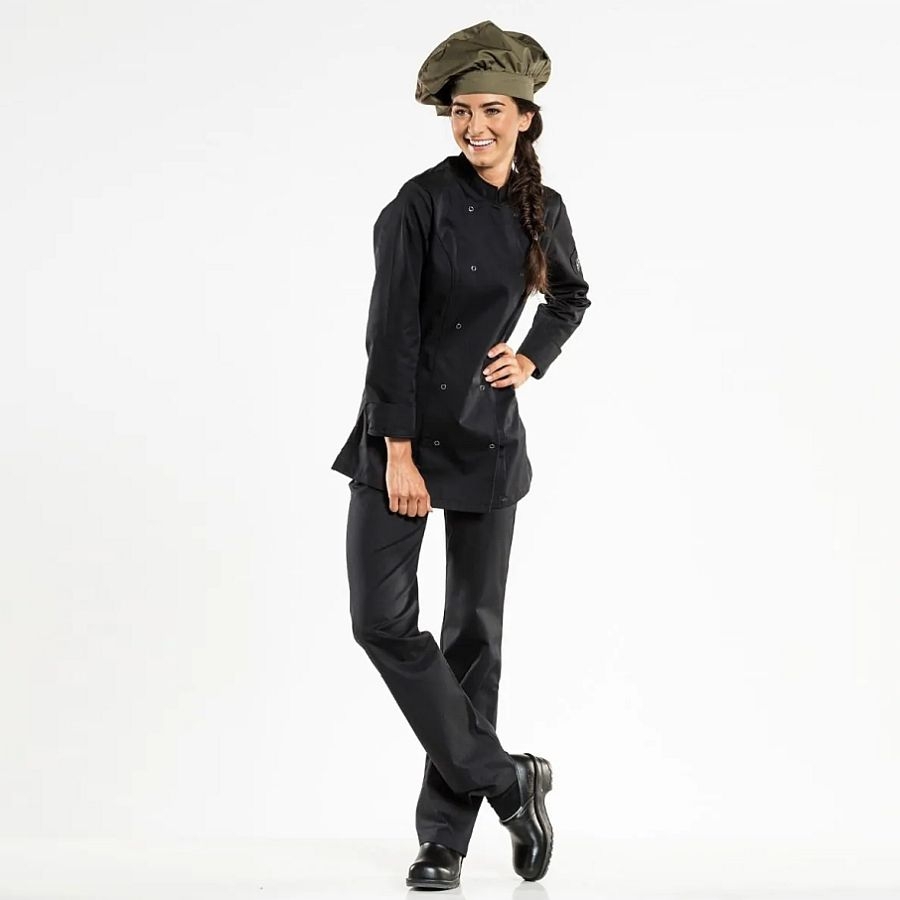 Die 993 Lady Poco Black ist eine schicke, minimalistische Kochjacke, die speziell für Damen entworfen wurde. Diese taillierte, tiefschwarze Kochjacke hat eine doppelte Reihe mit Druckknöpfen aus Edelstahl. Das macht die Lady Poco zu einer echten Allroundjacke.