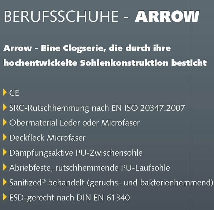 Der Abeba Arrow Komfort Clog wurde speziell für Arbeiten konzipiert, die langes Gehen und Stehen erfordern. Die dämpfungsaktive PU-Zwischensohle garantiert eine optimale Balance aus Stabilität und Dämpfung und schont Bänder und Gelenke, selbst auf harten Böden.