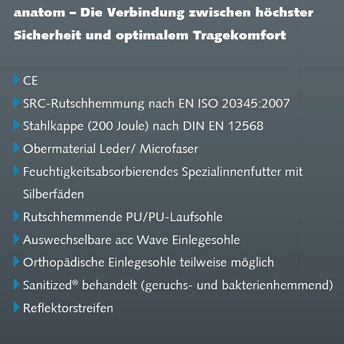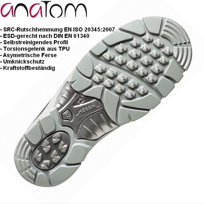 Ein Abeba® ANATOM Sicherheitsschuh garantiert ein Höchstmaß an Sicherheit in Kombination mit einem einzigartigen Tragekomfort und maximaler Haltbarkeit. Die robuste und abriebfeste PU-Laufsohle besitzt beste Rutschhemmungseigenschaften und sichert dem Träger durch das TPU-Torsionsgelenk einen sichern Halt. Verantwortlich für die hervorragenden Komforteigenschaften ist die geschäumte und dämpfungsaktive Zwischensohle. Die asymetrische Fersenkonstruktion simuliert einen bereits eingelaufenen Schuh und verhindert die hohe Hebelwirkung der Auftrittskräfte durch die abgerundete, hochgezogene Außenseite. Durch die senkrechte Innenseite wird ein Abknicken nach innen reduziert.