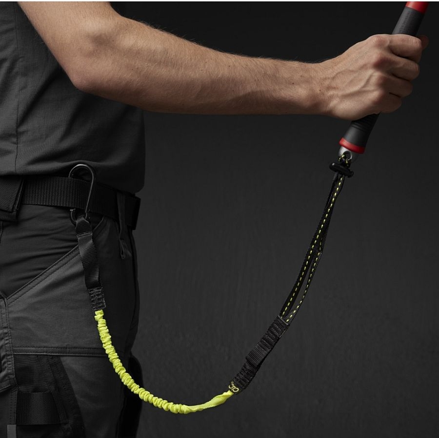 Unser Band besteht aus 12-mm-Gewebeband mit Expanderseil im Inneren und ist bis 110 cm dehnbar. Es ist mit einem robusten Karabinerhaken, einer 25-cm-Gewebebandschlaufe mit Zwei-Loch-Kordelstopper ausgestattet und für Werkzeuge bis 2,5 kg ausgelegt.