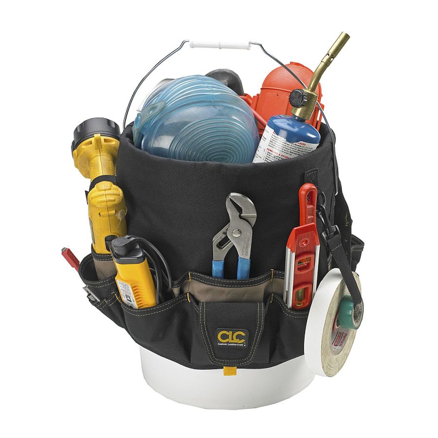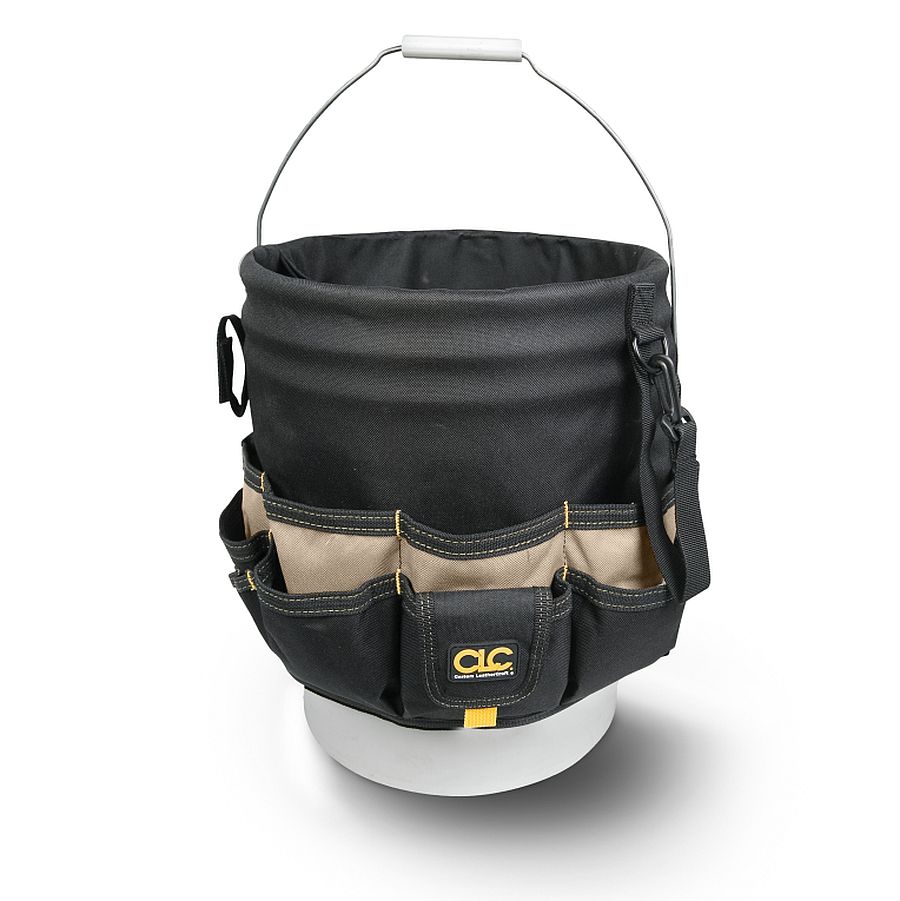 Dieser Eimer CL1001119 für Einsteiger ist ein Organisationswunder. Er hat 14 zweireihige Einstecktaschen innen und 34 dreireihige Einstecktaschen außen. Außerdem bietet er einen Klebebandhalter und eine Stecktasche für den Akku-Bohrer mit Sicherungsband.